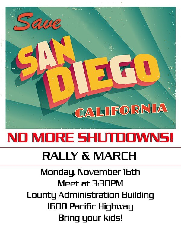 The state will implement ***“Purple Tier”*** restrictions on San Diego this Saturday, and our local leaders will acquiesce. Share this event notice with as many people as possible! Please come.